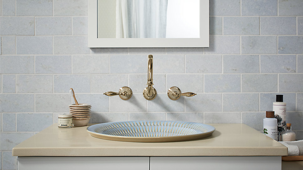 Keran Finial® yang menempel di dinding dalam Vibrant® French Gold melengkapi nuansa hangat dari lapisan Bluestone Rutile wastafel Derring ™.