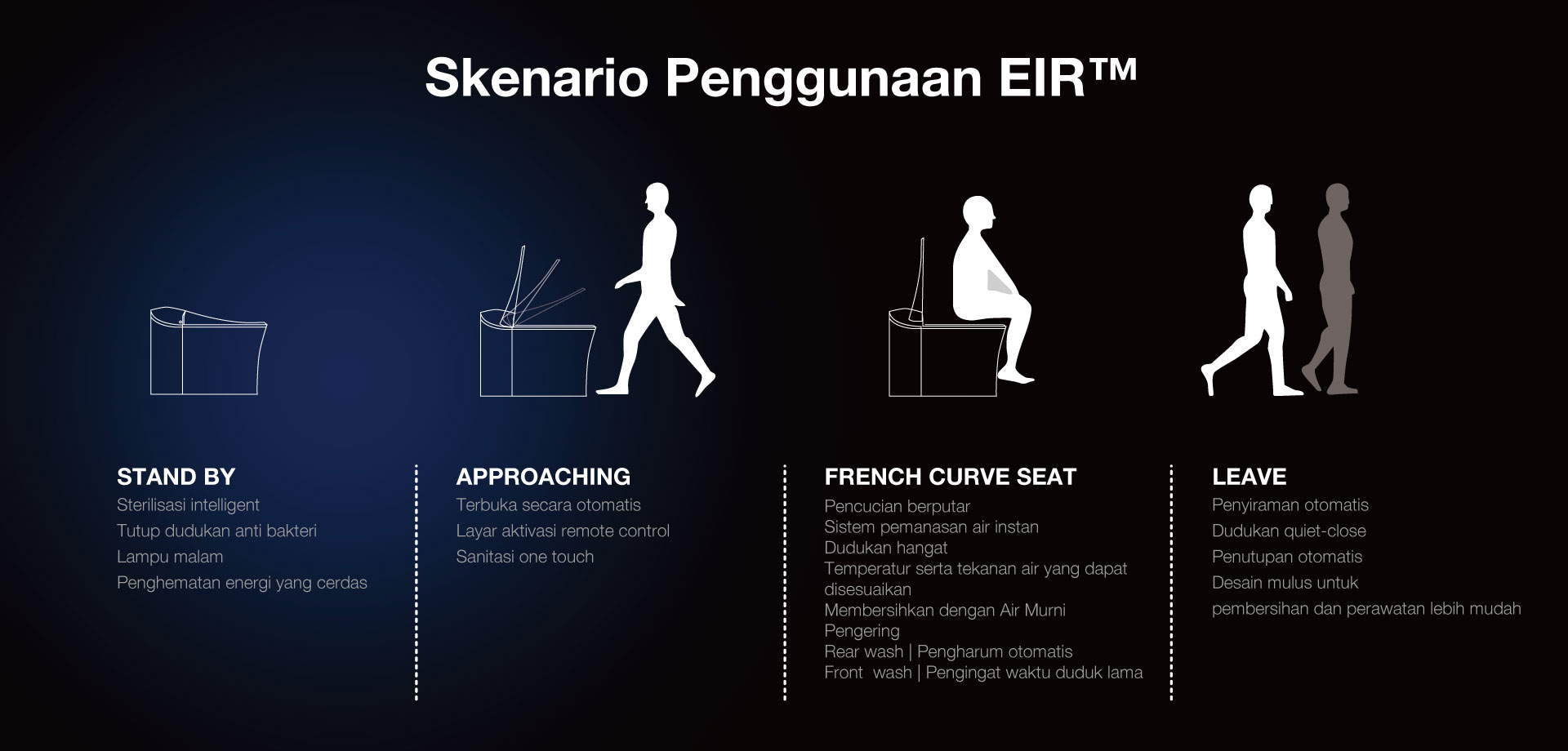 EIR™, intelligent toilet KOHLER yang baru adalah wujud keindahan dan inovasi. Dapat dipasang di dinding dan tersedia dengan S-trap maupun P-trap untuk kebutuhan pemasangan yang berbeda dan lingkungan dengan tekanan air rendah. Sistem filtrasi air EIR™ memurnikan air yang disemburkan dari tongkat ke tubuh, menyingkirkan kotoran, klorin serta logam yang tersisa, untuk pengalaman bidet yang lebih bersih. Tombol sanitizer satu sentuhan mengaktifkan fungsi Electrolyzed Water dan lampu UV untuk membersihkan mangkuk dan tongkat toilet, guna memastikan higienitas yang tak tertandingi.