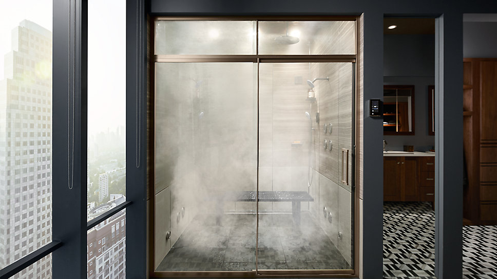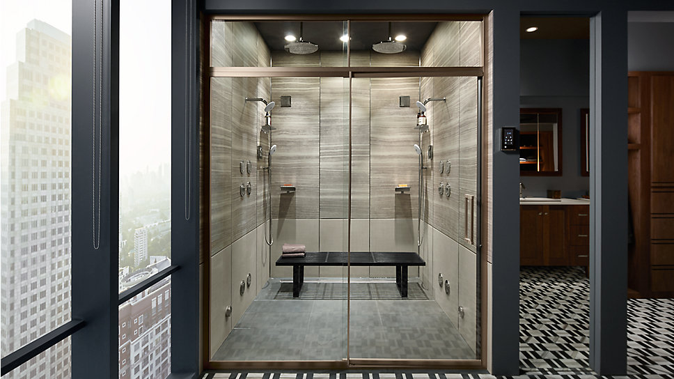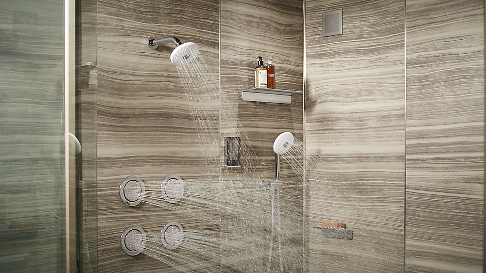 Dilengkapi dengan shower besar untuk dua orang, ruang ini menciptakan waktu bersama. Konfigurasi shower Twin DTV+™ mengajak Anda dan pasangan untuk menikmati pengaturan spa pribadi, bersama-sama atau sendiri, termasuk uap dan musik.